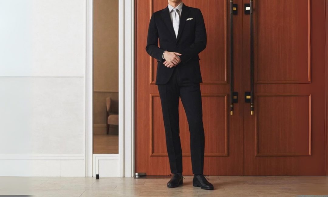 まずスーツは、日本式では礼服専用の漆黒の生地が一般的です。この漆黒は、通常のビジネススーツに用いられる「濃紺」や「チャコールグレー」とは異なり、光を吸い込むような深みを持ち、礼装としての重厚さを演出します。一方、欧米ではミッドナイトブルー(深い紺色)が格調高い色として選ばれることも多く、特に夜のフォーマルウェアにおいてはブラックよりも美しく見えるとされます。これは照明の下でミッドナイトブルーが黒以上に深く引き締まって見えるためで、英国王室やハリウッドのレッドカーペットでも長く愛用されてきた伝統があります。